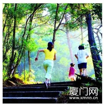厦门市摄影家协会副主席、秘书长赵建军:仙岳山有着良好的自然生态环境,山上林木郁郁葱葱,空气清新,是人们休闲锻炼的好去处。这幅摄影作品表现的是一家三口迎着朝阳上山晨练的瞬间。