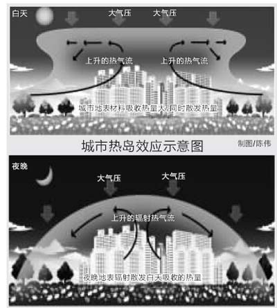 城区大量建筑物和道路的构成以砖石、水泥和沥青等材料为主,这些材料热容量、导热率比郊区自然界的下垫层要大得多,而对太阳光的反射率小、吸收率大;因此在白天,城市下垫层表面温度远远高于气温,其中沥青路面和屋顶温度可高出气温8℃~17℃。