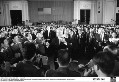 □1998年美国总统克林顿访问中国时与中方军乐团交流