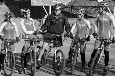 □2005年小布什访华时与中国自行车运动员一起训练