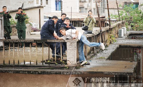 11月16日中午,一名云南男子因遭遇感情纠葛,爬上玉林市荔园菜市附近一住房楼顶欲寻短见。当地民警、消防人员苦苦劝说两个小时后,在该男子跳楼前将他救下。图为几名民警将失恋男子拖到楼顶的栏杆旁控制住。赵劲松 陈君铭摄