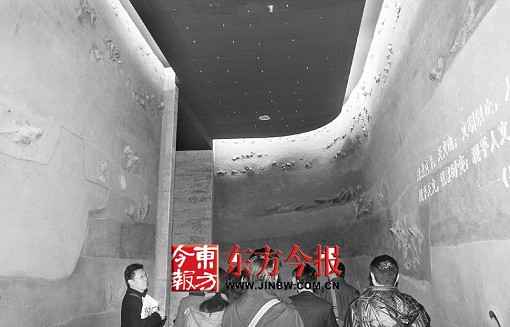 时光隧道的墙面上,其实就是考古学上的地层。墙最下端是远古时期,最上端是明清时期,土壤不同的颜色将每个朝代区分开来,每个朝代出土的文物造型,也都镶嵌其中,远古时期的石器、东周的兵器、隋唐的唐三彩、明清的青花瓷……从下往上,随着视线的不断转移,会看到墙体中不同的文物。“一进入展厅,这两面墙就会让观众震撼。这两面墙会使观众进入展厅就有进入考古工地的真实感觉,可以直观地感受到中原大地这本‘历史书’的厚重。”田凯说。