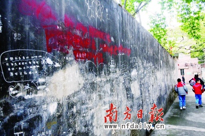 由于“示爱墙”旁边就是莞师附小,每天都有不少小学生从此经过。因此,有家长就担心孩子们看了墙上的留言会效仿,而且有些不良的信息对小孩产生不好影响。记者了解到,这面墙一直归东莞市特警支队管理。据门卫介绍,由于墙面的留言多是学生的示爱宣言,内容也不反动,而且平时也不太好管理,所以一直就“睁一只眼闭一眼”。