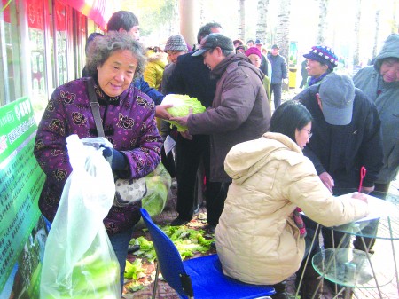 山东福寿园免费向市民发放爱心大白菜。 李杰摄