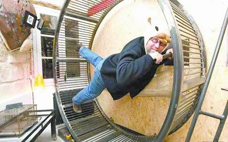 “仓鼠小屋”创办人法尔克罗戴上仓鼠帽,亲自演示跑滚轮。