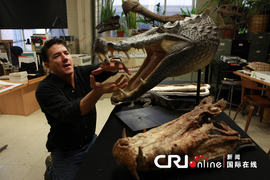 2009年11月18日,伊利诺伊州,芝加哥大学古生物学家Paul Sereno在他的实验室里展示一活体标本和在尼日尔发现的BoarCroc化石。