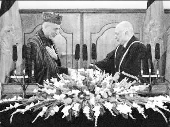 51岁的卡尔扎伊身着传统服装,在戒备森严的喀布尔总统府宣誓就职。他说:“我宣誓遵守和捍卫神圣的伊斯兰教义,遵守阿富汗宪法和其他法律,并监督法律的实施。”