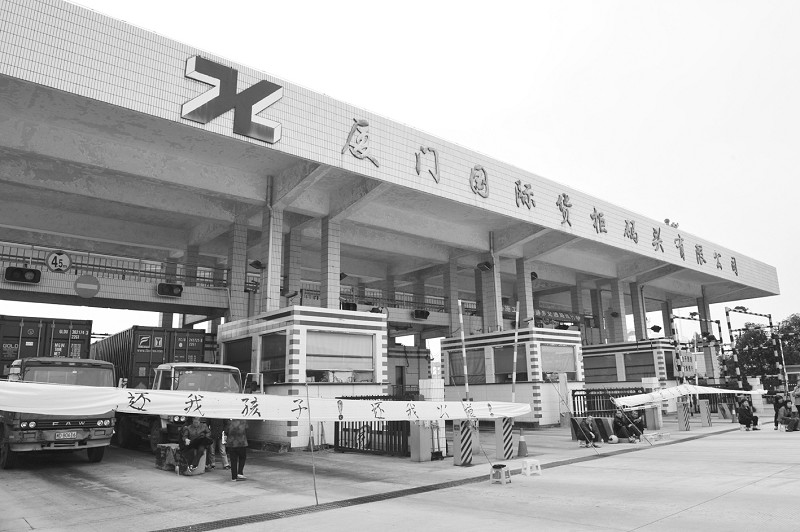 台海网11月20日讯 (海峡导报记者 李立宇/文 沈威/图)昨天上午9点,厦门国际货柜码头进出口遭白布条封门,导致车辆无法进出,采取这一行动的群众称:“我们要为惨死在码头里的亲人讨个公道!”