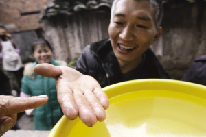 随后,记者来到离李强家十几米远的向婆婆家。“那天抽了一次水,结果发现里面有油,味道还很大、很臭,最后抽了两个多小时还是有油,我就再没用过井水。”向婆婆说。记者从向婆婆家的水井中舀了一盆水,有村民把手伸进水中搅动了一下后取出来,手上立即附着了一层油污。