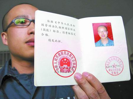 在省豫南监狱新建的教学楼内,有缝纫、计算机、汽修等职业培训班。“在这里,我们想学什么技能,都可以根据自己的兴趣自愿报名。”犯人梁丹告诉记者。家住信阳市的梁丹因故意伤害罪被判处有期徒刑9年。他在服刑期间,报考了电脑维修技术等级考试,目前已拿到高级职业资格证书(如图)。本着矫正恶习、学习技能、面向社会、服务就业的原则,省豫南监狱强化了对罪犯进行岗位和职业技能培训。每年多次组织对犯人的职业技能考核,并要求每名犯人出狱后,都能掌握一到两门职业技能。刑满释放人员周军兴奋地告诉记者,多亏了服刑期间获得了中级职业资格证,出去后他很快找到了月薪2000多元的工作。
