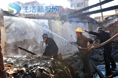 救援人员正在扑灭残火 首席记者 刘凯达 摄