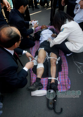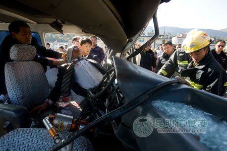 ????120急救医生介绍,因伤者较多,救护车分三次把10名伤者分别送到昆明市第一人民医院和昆医附一院。被送往昆明市第一人民医院的7名伤者中,金杯车司机李师傅伤势最重,送到医院后,医生立即为他做手术。其余6人已无生命危险。(都市时报 记者李佳健 首席记者朱勋航)