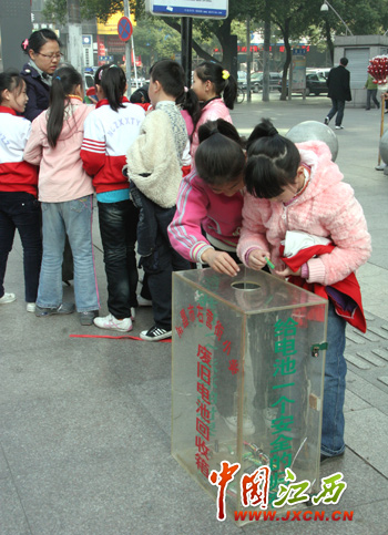 中国江西新闻网11月26日南昌讯(记者 邓小勇 报道)南昌市右营街小学成功申报“国际生态学校” ,这是江西省首家获此殊荣的单位。11月26日上午,该校40多名学生走上步行街,向居民发放“绿色出行倡议书”,在倡议书上签字,并现场收集废旧电池。学生们希望通过自己的行为呼吁全社会加入到建设生态城市的行列中来。