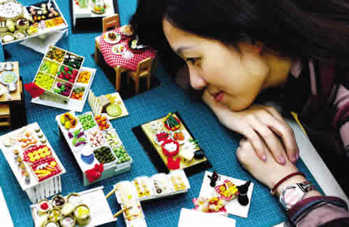 陈瑜坦言,制作微型黏土需要花费很多精力,过程异常枯燥,但在成品诞生的那一刻,满满的成就感也是最难忘的。从做出第一件被父亲称赞“做得很像”的成品到现在,两年多来,她的作品已经摆满一个陈列柜了。一花一世界,一沙一天堂。陈瑜的微型黏土王国里,又藏着什么秘密呢?
