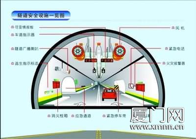 隧道中的设施非常多,有火灾报警器、消火栓箱、灭火器箱、应急通道、紧急停车场;在隧道顶部,有情报板、车道指示器、逃生指示标志、通风机。
