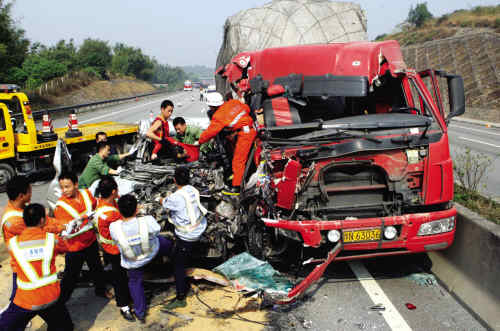 惨烈的连环车祸,沿着京珠高速往北愈加惨烈。在距离第四起交通事故事发点约30米处,两辆车牌号分别为赣CF2351、豫N63036的货车将一辆银灰色商务车夹扁,商务车中一名中年男性司机当场死亡。