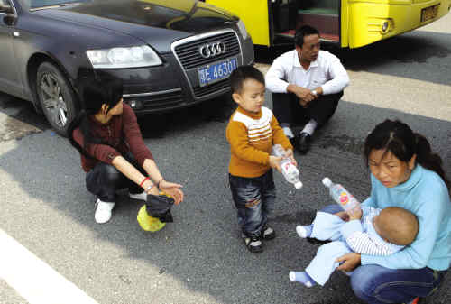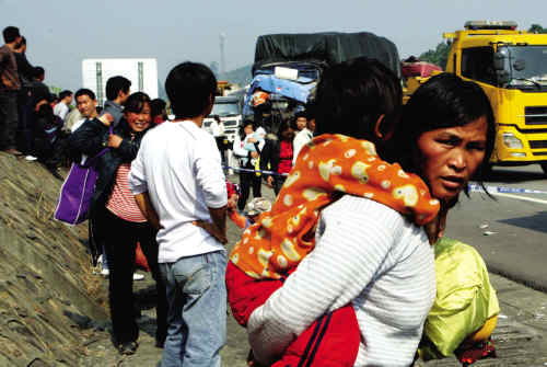 多辆车发生事故,导致京珠高速路上数百名乘客滞留。交通部门将车辆受损严重的乘客先疏散到瓦窑岗服务区安置,再安排其他车辆疏散。而车辆受损不严重的乘客,只能在路面上等待。为了打发时间,很多人围坐在一起打牌、闲聊或者看书。记者发现他们当中大都是北方人,太阳出来后都赶紧将大衣脱下,跑到护栏外的草地上找阴暗处乘凉。一些带着孩子南下打工的夫妻则比较苦恼。中午时分,大人饿着肚子随便找点干粮充饥都能解决,但嗷嗷待哺的小孩一哭起来就“不可收拾”。这时的高速路上,就像一个大街市一样热闹。“急也没用,没受伤已经万幸了!”乘客小曾说。