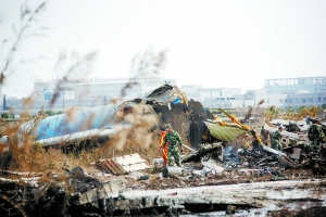 失事飞机蓝白相间,机身已经断成两截,机尾断成了2到3截,现场一片狼藉。事故发生后,有消息称,失事飞机撞向东航仓库,致使东航仓库起火。不过,据现场人士透露,失事飞机解体时撞到了机场的一些设施,但现场并没有东航仓库着火。失事飞机上装载的只是普通货物,事故发生时除了撞毁机场的照明等设施之外,并未造成进一步的损失。
