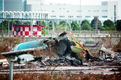 28日8时12分,飞机在浦东国际机场起飞时冲出跑道着火,9时火势被扑灭。飞机失事现场一片狼籍。新华社发