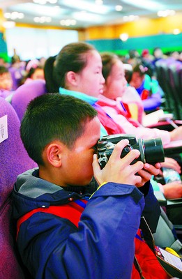 校园小记者不失时机抓拍精彩镜头。