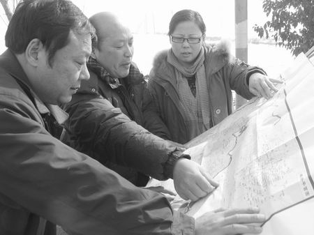 贺金峰(中)等人在对着地图考察夏路
