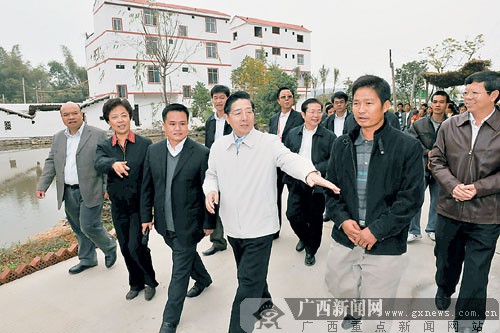 12月1日上午,自治区领导郭声琨、陈际瓦、高雄在平果县新安镇新安村庄内屯参观考察,实地感受城乡风貌改造给当地群众生产生活带来的巨大变化。 记者 刘宇/摄