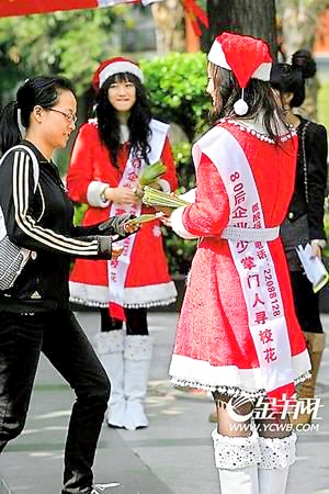 据新快报报道 12月1日中午11时许,暨南大学食堂门口人头涌涌,热闹非凡——6位身穿火红圣诞短裙、头戴圣诞帽的高挑女孩,瞄准来往的漂亮女孩,派发“80后企业少掌门寻找青春美丽校花”的征婚传单。原来,这是两位80后“富二代”在征婚。不过,传单上无当事人真实姓名、无照片惹来争议,不少女生认为这是一场秀,直言不会应征。