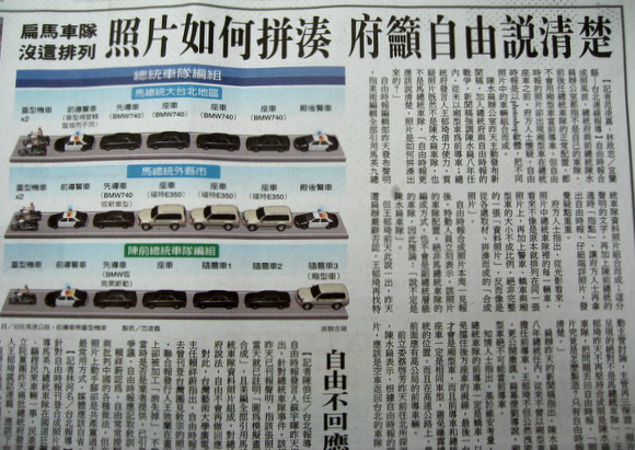 《自由时报》合成照片本周一见报后,特勤人员立刻表示,该照片的车队配置,绝非马“总统”车队的编成方式,也不会是“副总统”层级的车队,因此推论:“说不定是陈水扁车队”。