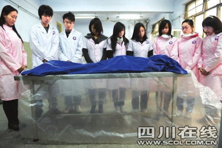 前天下午,成都医学院的同学们像往常一样来到实验室上解剖课。一场特殊的祭奠由此开始。“同学们,让我们用自己的方式祭奠我们面前这些不知名的老师,感谢他们对医学事业的贡献……”同学们默默地低下头,向着解剖台,向面前躺着的“老师”默哀。简短而庄重的仪式结束,老师走上讲台,开始这堂解剖课……