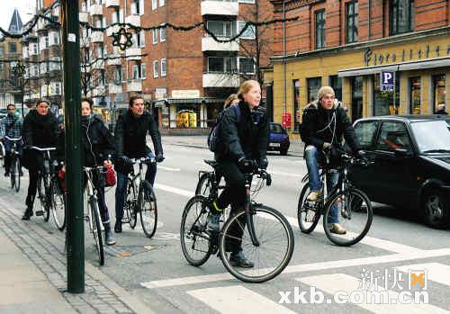 为鼓励人们骑车出行,哥本哈根市逐步建成了覆盖整个市区的自行车道路网络。贯穿全城的自行车专行道达350公里。自行车道与汽车道、人行道从高度上各自分开,一目了然,互不干扰。