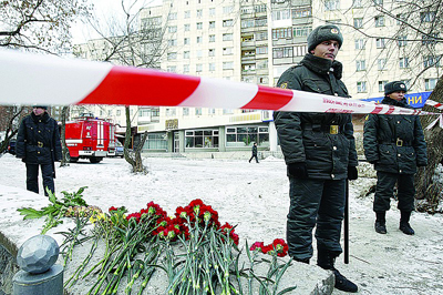 警察在发生爆炸的夜总会入口处执勤,路边摆放着悼念的鲜花 新华社发