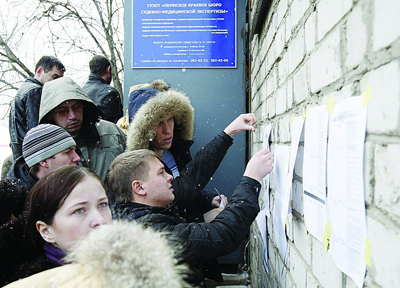 人们在张贴于医院太平间外的遇难者名单上查找亲属的名字 新华社发