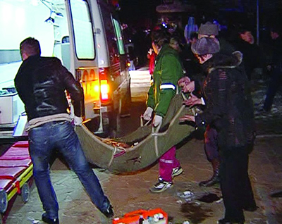 护理人员把爆炸事件中的伤者抬上救护车(视频截图) 新华社发