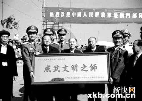 解放军从珠海军营出发至澳门龙成大厦军区,全程约16公里。到了友谊圆形地,澳门总商会会长马万祺即代表澳门各界人士,向驻澳部队赠送“威武文明之师”的金匾和写有“威武之师文明之师”的锦旗。