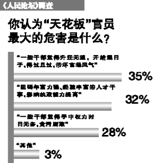 大多数官员达到一定级别后,晋升空间越来越小,从而在不同阶段上遇到自身仕途的“天花板”。处在这种状况官员被形象地称为“天花板”官员。新一期《人民论坛》调查显示,现行干部制度的硬性规定和操作惯例等,促使“天花板”干部在“45~55岁”这一年龄段上扎堆,同时多数人认为县处级“天花板”干部最多。