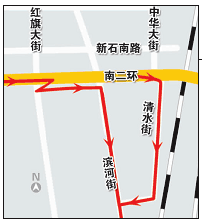 从南向北:由裕华路东二环桥口下右转调头-二环外侧车道-槐中路。从北向南:由东二环裕华路桥口上辅路南行-槐中路(记者何昳)