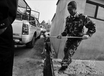 一条条流浪狗被工作人员用工具叉下收缴车。供图
