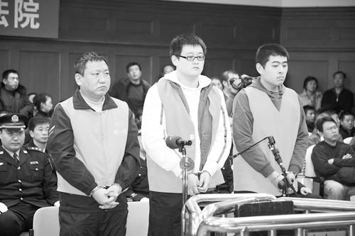 2009年12月8日,亿万富豪王文襄(左一)涉嫌故意杀人一案,在黑龙江省哈尔滨市中级人民法院公开审理。 哈尔滨市中级人民法院供图