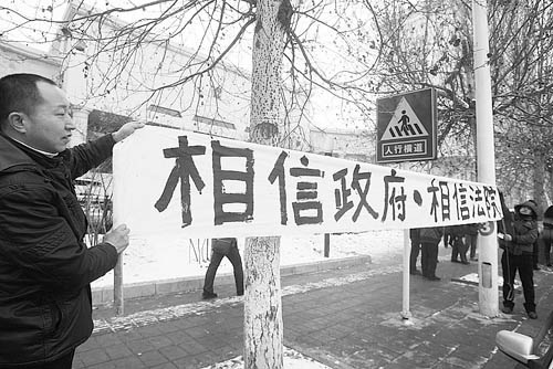 受害者家属和朋友在法院外拉起大条幅。苏强/CFP供图