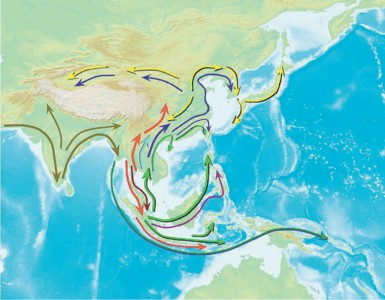 对中国历史而言,这意味着,北方人的“老家”其实在南方。中国人的祖先先是到达了中国南方,在那里繁衍,此后再进入黄河流域,创造出灿烂的中华文明。在整个亚洲的迁徙路线问题上,研究人员认为,在距今5万到10万年前,亚洲人的祖先走出非洲,沿着印度洋沿岸迁徙,到达东南亚;并在距今3万到4万年前,开始从东南亚往北迁徙,逐渐遍布整个东亚,直至中亚地区。因此,所有亚洲人群在遗传学上都存在着相当可观的关联性,因为他们的主体都是这一支“迁徙大军”的后人。