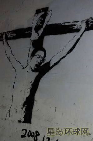 台北看守所大门围墙上被人画上一幅仿造耶稣钉在十字架上的图画,但人像换成陈水扁。