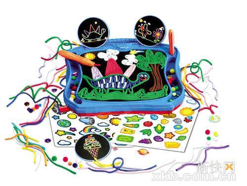 鲜艳漂亮的彩绳画作绝对能吸引孩子们的注意力,而让他们自己动手“绘”画,无疑是启发他们想象力的最佳方式。这个英国出品的彩绳绘图工具包括画板一个、画“笔”数支、长短不一的彩绳以及配饰珠子。画板上有密密麻麻的小勾刺,以便牢牢粘住贴上的彩绳,但彩绳又能被轻易扯离画板,方便重复使用。画“笔”方便孩子们将彩绳准确粘好。确实是非常讨人喜欢的玩具。