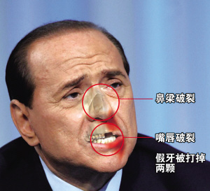 当地时间13日晚,73岁的意大利总理贝卢斯科尼在米兰出席政治集会时突遭一名男子袭击。被撂倒在地的贝氏面部受伤,口鼻流血。初步诊断结果显示,老贝的鼻骨骨折,两颗牙被打飞。
