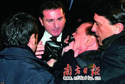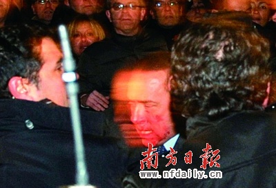 此时,身处座驾后座的贝卢斯科尼面部“危险三角区”已满是鲜血。但他随后走出汽车,似乎想显示自己受伤并不严重,但立即被随行安保人员再次摁入车内。