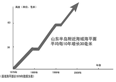 来自国家海洋局的《2008年中国海平面公报》显示,烟台附近海域海平面正在以平均每年3毫米左右的速度抬升着,未来30年将会升高68毫米—120毫米。