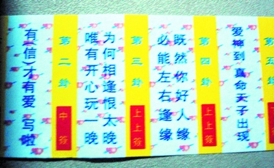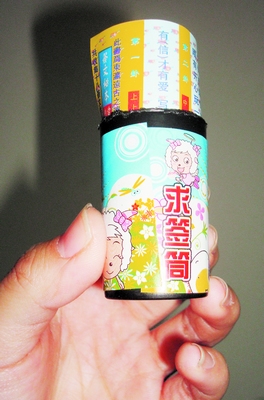 记者打开“求签筒”,看到所谓“签文”上写有“恭喜,恭喜,你终于有喜”等内容。记者仔细看了一下,竟发现“签文”中有不少错别字。
