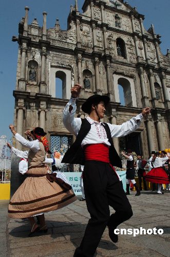 资料图片:土生葡人在澳门大三巴牌坊前跳起欢乐的舞蹈。中新社发史利 摄版权声明:凡注有“cnsphoto”字样的图片版权均属中国新闻网,未经书面授权,不得转载使用。【更多图片】