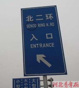 在二环路与谈固大街交叉口附近,一处交通标识牌倒是用了正确的英语表述,但是由于制作时粗心大意,把“SECOND”写成“SENOD”,不仅单词中少一个英文字母,而且拼写顺序也不对。