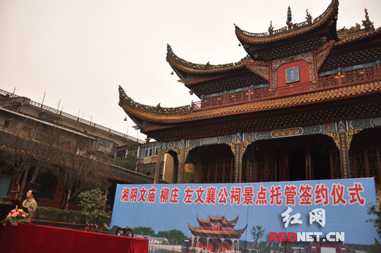 (今天在湖南省湘阴县文庙举行的景点托管签约仪式。)