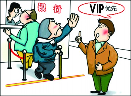 从另一个角度看,银行作为企业,还有其特殊性,因为其还担负着为广大公众提供金融服务的公共职能。作为提供社会公共服务职能的银行,有义务,也有责任,在提供相应服务时维护良好的社会秩序。但是,当VIP能够从排队人群中随意“加塞”时,这难道不正是对社会秩序的一种破坏吗?